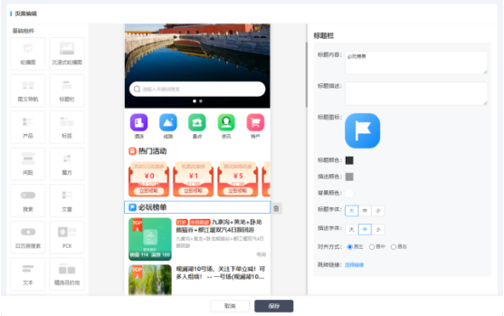 標題欄:設置標題內容、描述、圖標、顏色、字體大小、對其方式、跳轉鏈接,若標題無需描述,則不填內容。