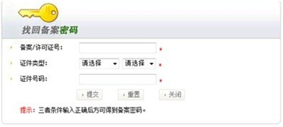 方式一:在線找回備案密碼的操作(如果用戶以前的聯(lián)系資料不真實(shí),無(wú)法收到密碼,則不能通過(guò)此方法得到備案密碼)