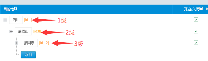 1、需要進行結(jié)伴地點的目的地,需要設置目的地,一定要三級菜單樹狀形??