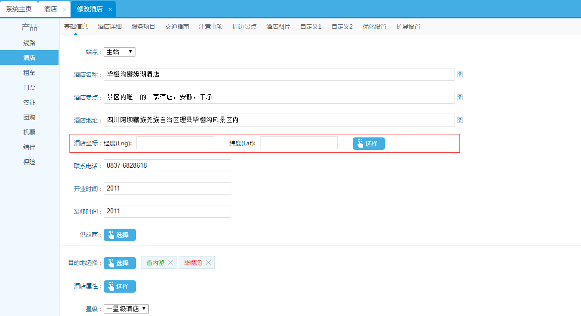 第二步:在后臺設(shè)置景點和酒店產(chǎn)品地圖坐標(biāo)