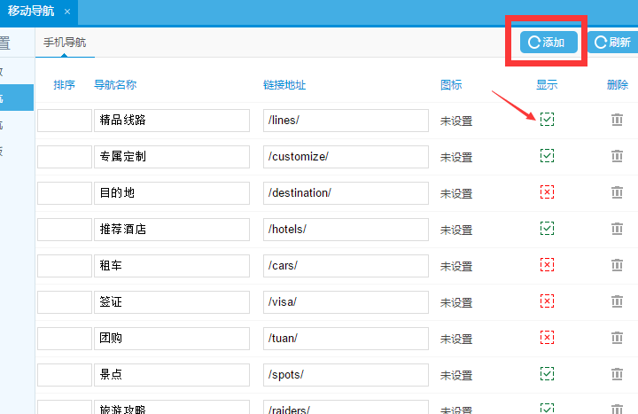 第二步:添加主導(dǎo)航,添加完成后,是否需要前臺展示進(jìn)行勾選。