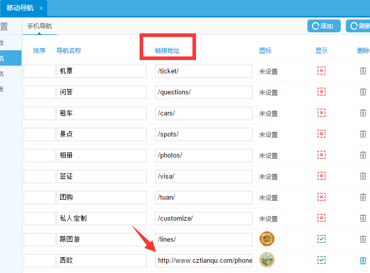 主導(dǎo)航添加成功后,需要加上有效的鏈接地址才能夠進(jìn)行頁面的跳轉(zhuǎn)。比如:添加一個(gè)西歐的主導(dǎo)航,鏈接地址就需要您在移動(dòng)版網(wǎng)站前臺,搜索找到西歐這個(gè)目的地,然后復(fù)制這個(gè)頁面的鏈接到移動(dòng)導(dǎo)航的鏈接地址上面,這樣點(diǎn)擊西歐這個(gè)主導(dǎo)航,才能跳轉(zhuǎn)到關(guān)于西歐的產(chǎn)品頁面。(鏈接是需要移動(dòng)版鏈接)