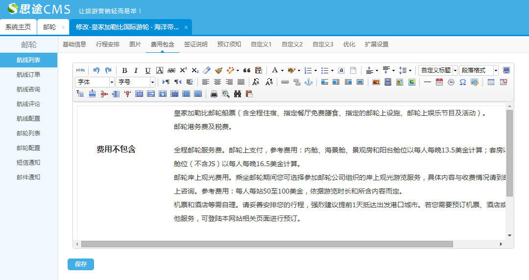 (1)添加基礎信息:包括郵輪名稱、郵輪介紹、所屬的郵輪公司、以及郵輪的基礎信息等