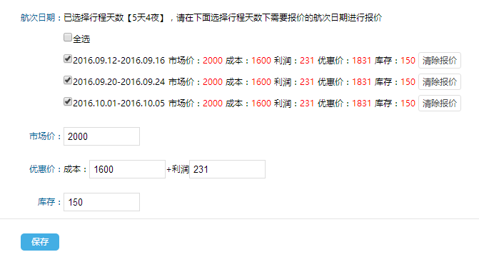 (3)報價:將日期選擇后,填寫市場價和優惠價,可將所有航期均報上價