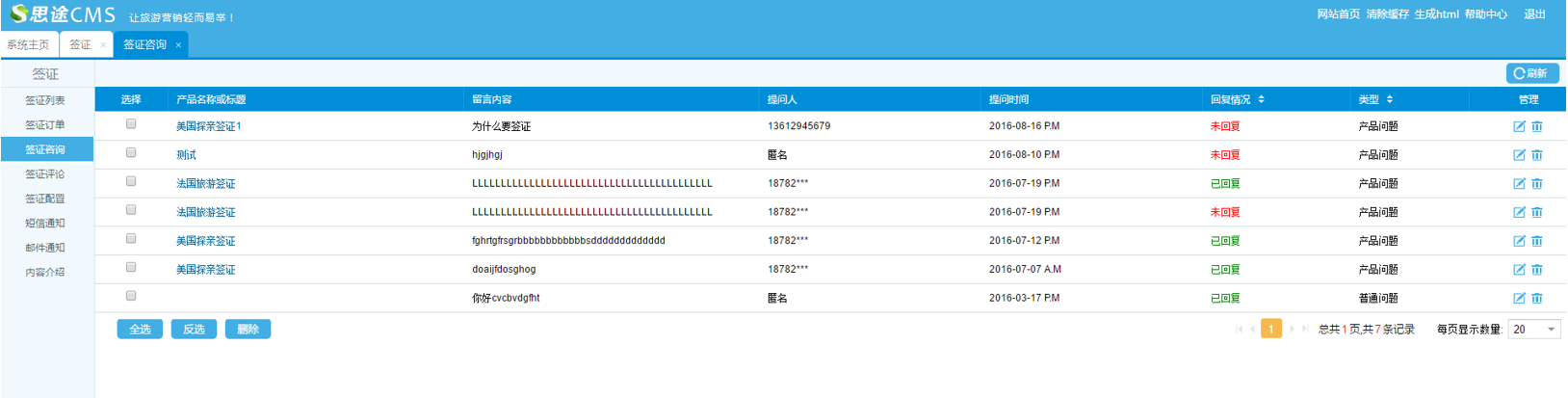 可以針對(duì)簽證在前臺(tái)產(chǎn)品詳情頁(yè)進(jìn)行咨詢的問(wèn)題進(jìn)行回復(fù)管理。