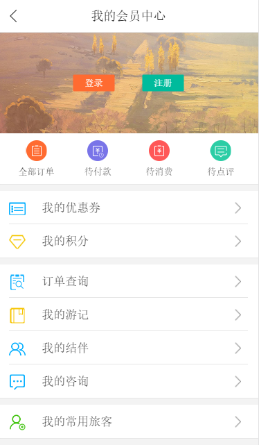(1)在未登錄的情況下,點擊訂單查看、我的優惠券、我的積分、我的游記、我的結伴、我的咨詢、我的常用