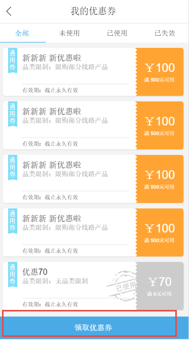 B、點擊進入我的優惠券頁面:可以切換頁簽篩選全部、未使用、已使用和已失效的優惠券列表