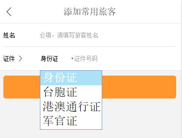 A、添加常用旅客:證件類型默認包含身份證、臺胞證、港澳通行證、軍官證