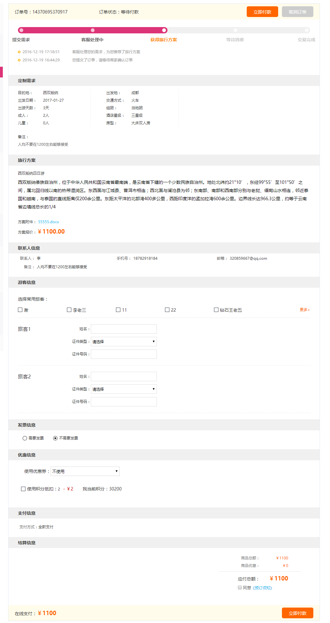(4)前臺在會員中心查看訂單詳情:可以選擇付款和取消訂單后臺系統配置中勾選了游客信息和發票,則需要填寫信息: