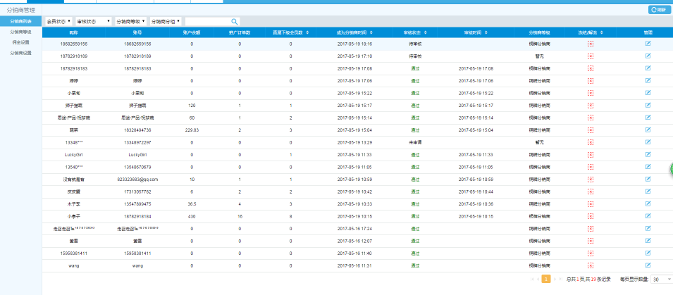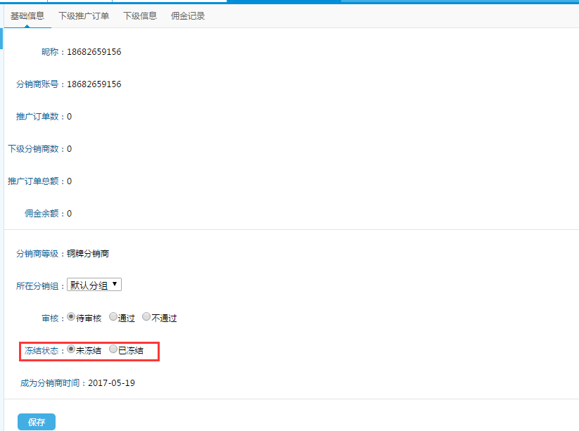 查看分銷商訂單數、下級數量,管理分銷商所在分組、審核情況、凍結狀態等