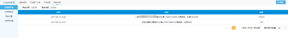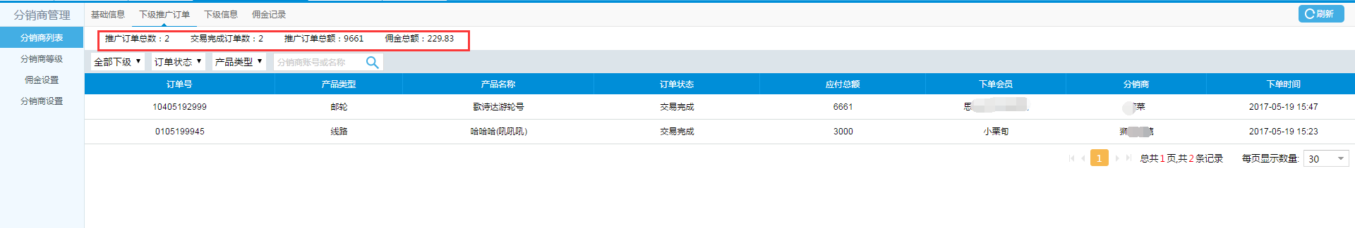 分銷商及其下級推廣的訂單信息,在此展示,方便管理員管理單個分銷商的分銷過程。