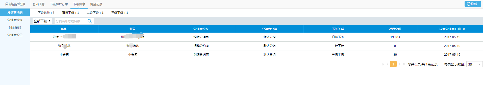 分銷商的一級下級、二級下級、三級下級及獲得的相關傭金收益都會在此展示