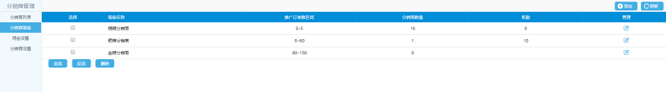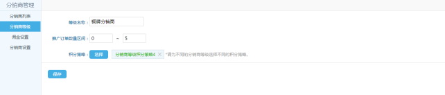 分銷商等級是根據分銷商推廣訂單數量來劃分的,管理員可以設置等級范圍、等級名稱、以及對應等級分銷訂單完成后可獲得的積分獎勵。