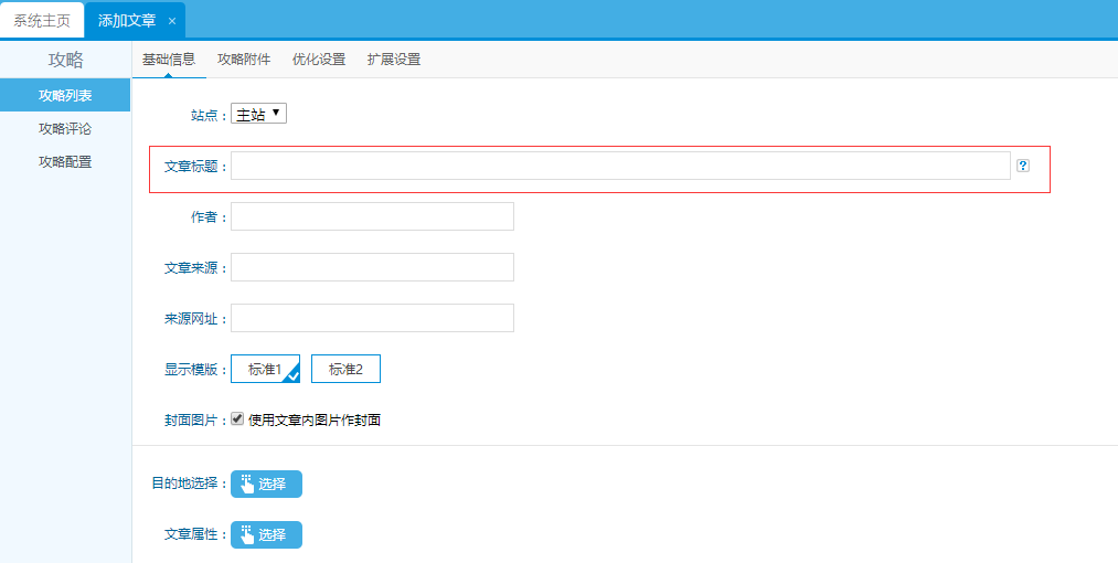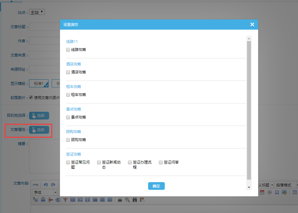 8、文章屬性:設置文章的屬性分類,例:攻略、出行路線、指南等,方便用戶按屬性查看文章
