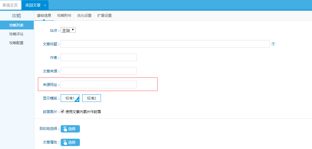 7、目的地選擇:設置文章需要顯示到的目的地分類,方便用戶按目的地查看文章,目的地在攻略配置里面進行配置