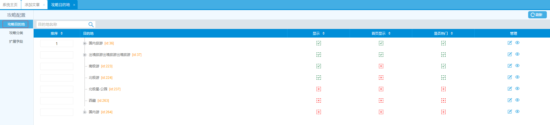 7.1 目的地在攻略配置-目的地選擇開啟或關閉,以及是否首頁顯示以及是否熱門。
