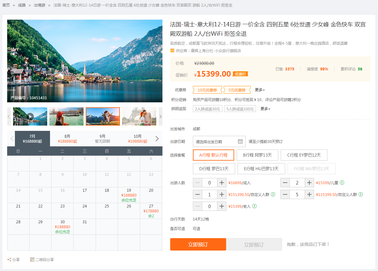 和途牛的做法一樣,新版的線(xiàn)路模板也將團(tuán)期、優(yōu)惠促銷(xiāo)等信息放在了游客瀏覽頁(yè)面時(shí)第一眼就可以看到的顯眼位置,相比舊版的線(xiàn)路詳情頁(yè),重點(diǎn)信息更加突出,也可以更好地起到促成轉(zhuǎn)化的效果。
