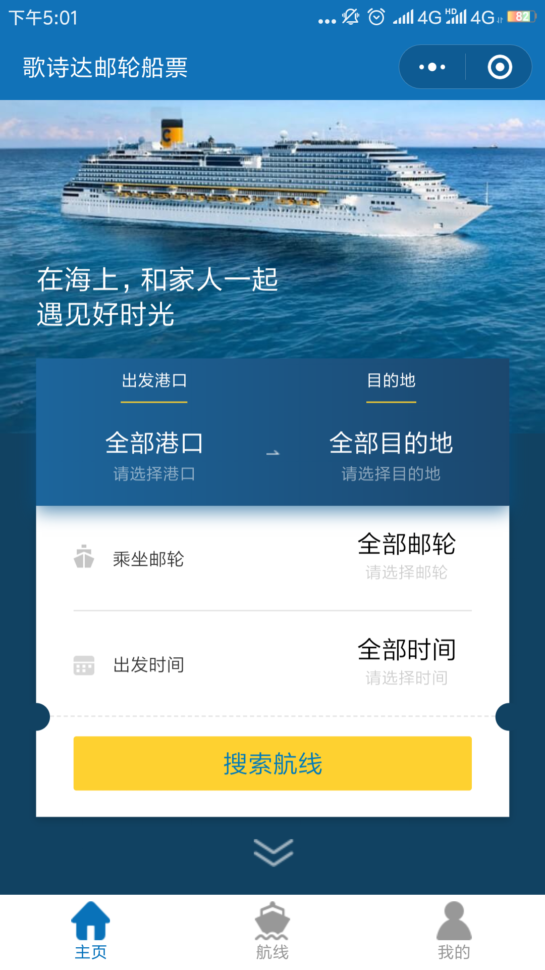 該小程序主要是郵輪船票的預定,整個頁面以藍色為基低,充滿海洋的氣息。頁面的中心直接選擇出發港口以及目的地預定,十分簡潔。同時還有著近段時間熱門活動的推送,本周的熱門航線、甚至還有一些目的地港口城市的介紹。