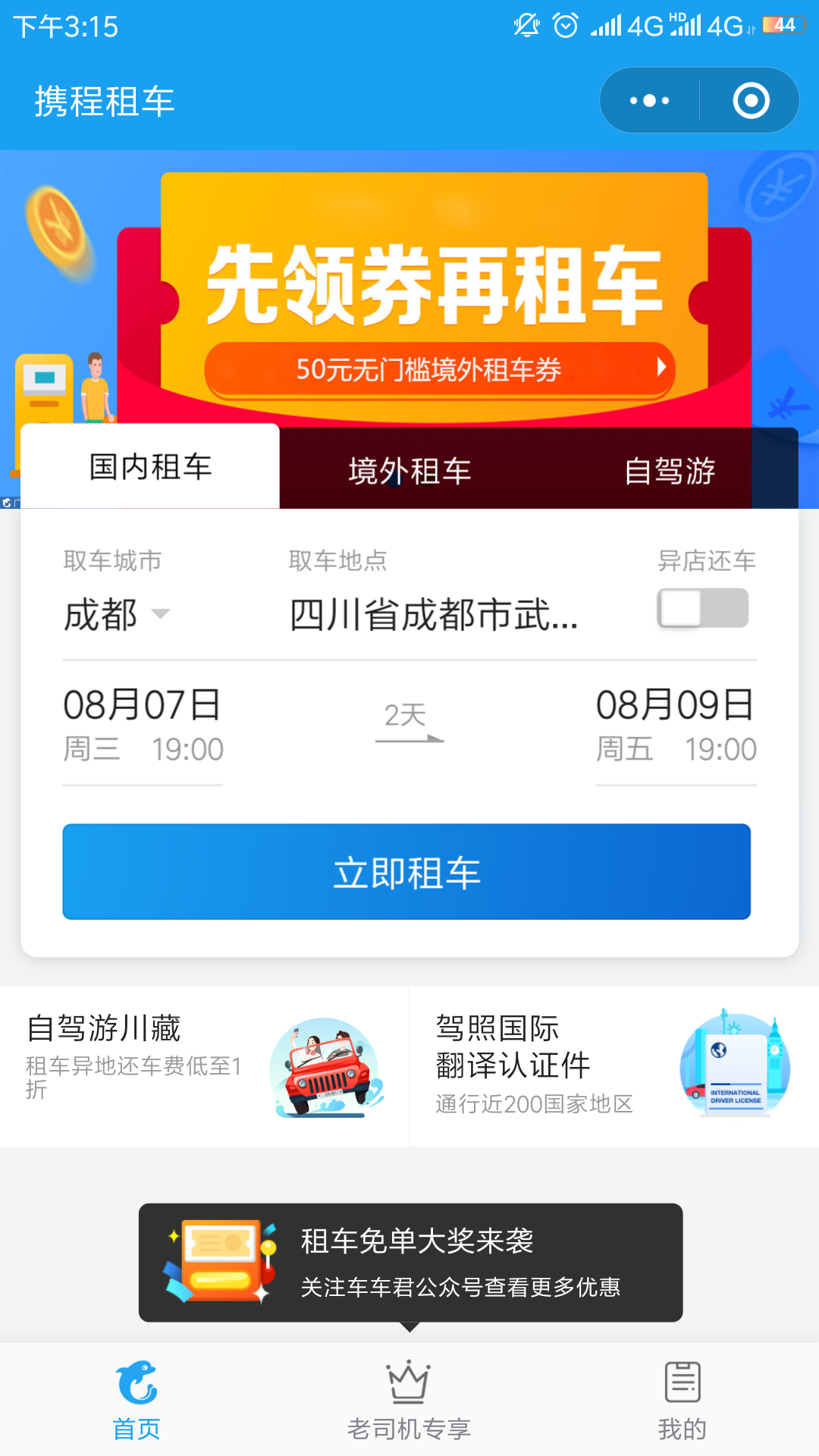 該模板把優(yōu)惠券放在了banner圖吸引游客,導(dǎo)航欄包含國內(nèi)租車、境外租車、自駕游模塊。在租車模塊的下面通過選擇取車城市、地點(diǎn)、是否異店還車、還車時(shí)間,就可以直接租車;下方還顯示著自駕游川藏和駕照國際翻譯認(rèn)證件,為游客提供了極大的便利。同時(shí),在老司機(jī)專享頁面,采用了于公眾號關(guān)聯(lián)的措施,提高游客的留存率。