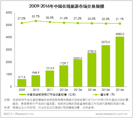 艾瑞咨詢認為,2012年中國在線旅游市場交易規模快速增長,主要源于機票、酒店、旅游度假等細分市場不同程度的增長,具體而言:機票依靠較高的發展成熟度,繼續以較快的速度向傳統機票預訂滲透;酒店在線預訂率低,但隨著核心OTA及連鎖酒店在線業務的拓展,酒店團購等預付產品的市場認可,酒店在線預訂得到快速增長;旅游度假方面,周邊游、出境游的火熱,以及目的地營銷的興起,使得旅游度假成為增速最快的細分市場。