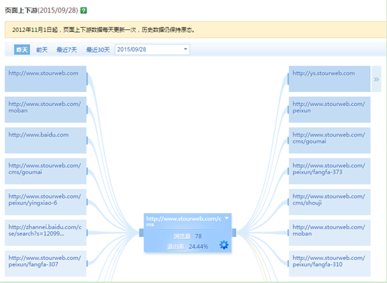 通過頁面上下游,我們可以設(shè)置需要分析的頁面,獲知他們的來路以及流量從這個頁面分發(fā)后又進入了哪些頁面。