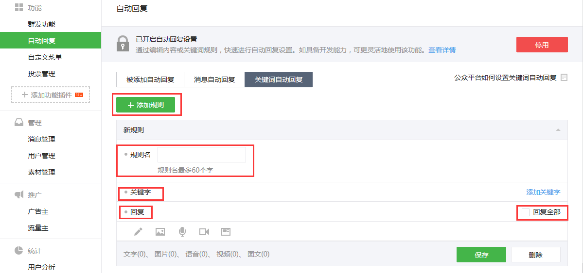 規則名稱可以根據自己的需要自由設置,自己可以在后臺區分開就行;關鍵字的設定需要仔細斟酌之后再定,站在粉絲的角度思考針對某一事項可能會發來什么樣的詞語。建議在一個規則里設置一個關鍵字就好,以便讓粉絲獲得想要的答案。