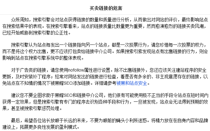 以下鏈接是關于百度對于買賣鏈接危害的官方描述以及懲罰態度: