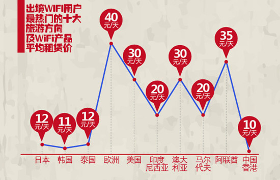 另外,《報(bào)告》數(shù)據(jù)顯示,使用出境WiFi用戶(hù)最熱門(mén)的十大旅游方向及WiFi產(chǎn)品平均租賃價(jià)分別為:日本(12元/天)、韓國(guó)(11元/天)、泰國(guó)(12元/天)、歐洲(40元/天)、美國(guó)(30元/天)、印度尼西亞(20元/天)、澳大利亞(30元/天)、馬爾代夫(20元/天)、阿聯(lián)酋(35元/天)、中國(guó)香港(10元/天)。