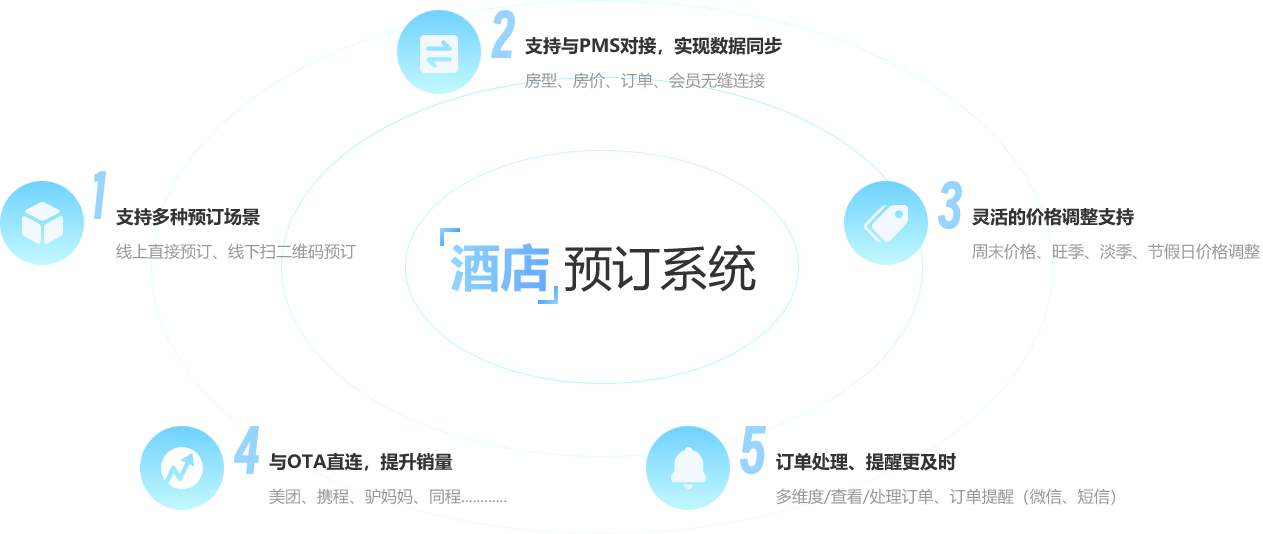針對(duì)酒店提供一整套完善的線上電商解決方案,主要解決酒店在線預(yù)訂需求,10端合一,可支持多渠道售賣,